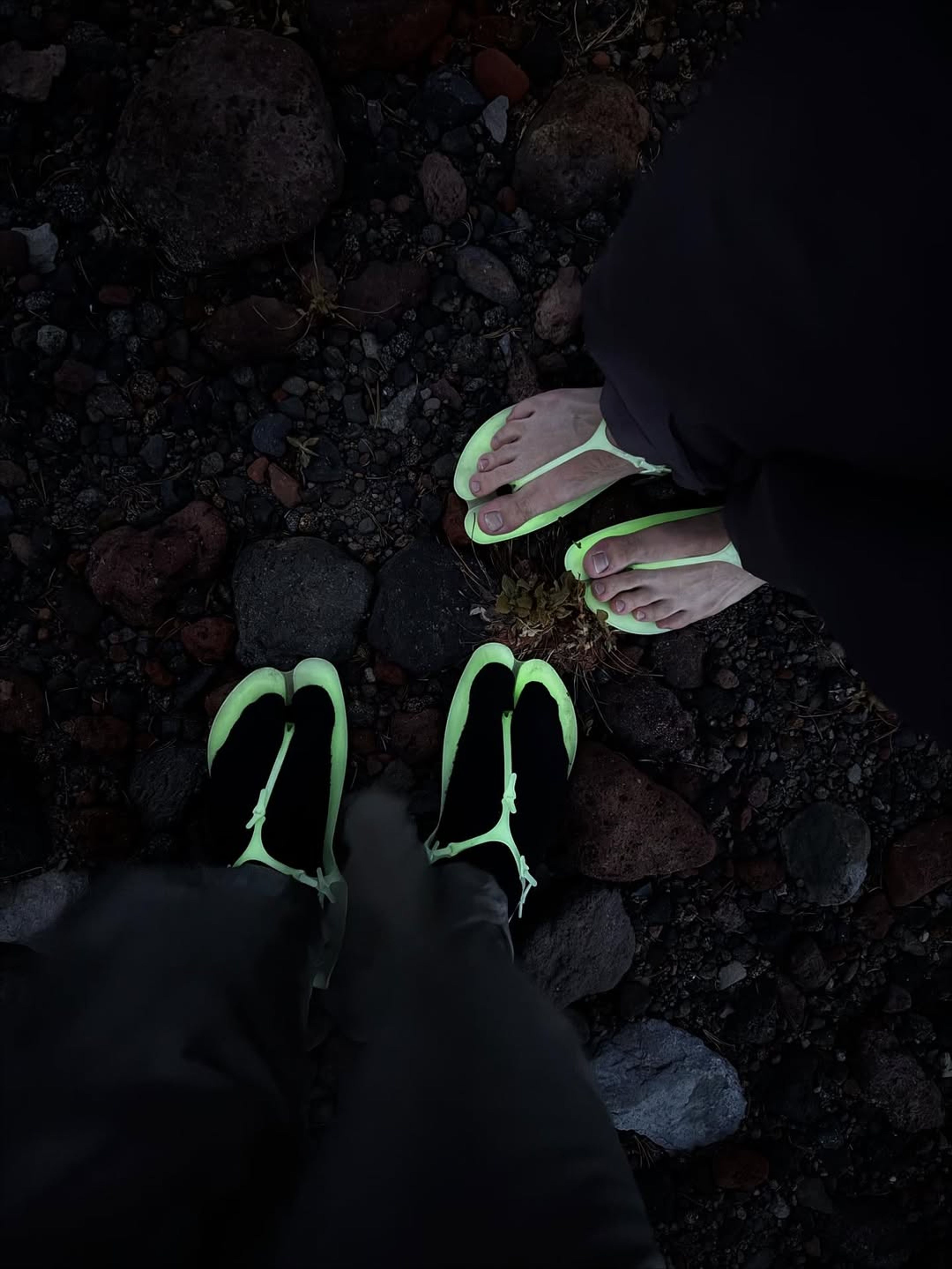 ‘풋프린트 캠프 샌들’은 전량 유연한 TPU 소재로 제작되었다. 무게를 최소화하면서도 접지력과 쿠션감을 확보했고, 야광(GITD, Glow-in-the-Dark) 기능을 더해 야간 숙영 환경에서도 가시성을 유지할 수 있다. 4mm 두께의 플랫 프로파일은 탁월한 휴대성을 제공하며, 봉투 하나에 들어갈 정도로 컴팩트하게 패킹할 수 있다. 오픈 구조의 와이드 풋베드 디자인은 통기성과 건조성을 높여, 계곡과 강을 건넌 후에도 빠르게 마를 수 있도록 설계됐다.